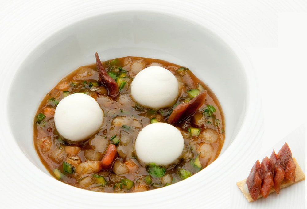 A modo de estofado de Salazones: Vegetales, anchoas y papada con bombones de Idiazábal