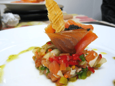 atka: se trata de un aperitivo con salmón que hicimos hace tiempo pero que nos encanta. Mezcla en un bol los siguientes ingredientes: cangrejo real ruso, pimientos del piquillo verdes y rojos, tomate, cebolleta y alíñalo con un toque de aceite, vinagre y albahaca. Coloca un pequeño montoncito en un plato, sobre él un rollito de salmón y rellénalo con caviar (puedes sustituirlo por gulas).