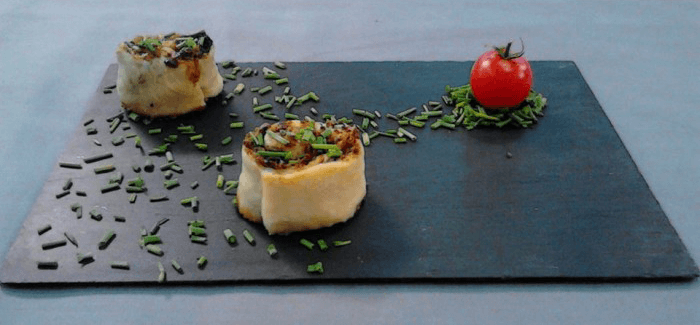 Hojaldre relleno de Jamón Ibérico, Torta del Casar y Boletus