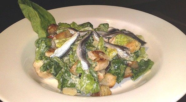 - Para terminar aliñamos con nuestra salsa César ya preparada y decoramos la ensalada con unos filetes de anchoas por encima. Puedes añadirle también unos taquitos de pan tostado al gusto.