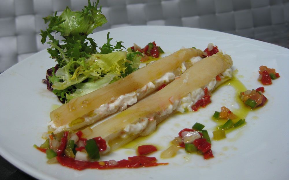 Recetas con Espárragos de Navarra con cangrejo real ruso, verduritas y vinagreta de mostaza