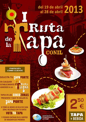 Ruta de la Tapa de Conil 2013: Del 19 al 28 de abril de 2013 se celebrará la I edición de la Ruta de la Tapa de Conil de la Frontera, Cádiz, organizada por la Asociación de Empresarios de Conil.